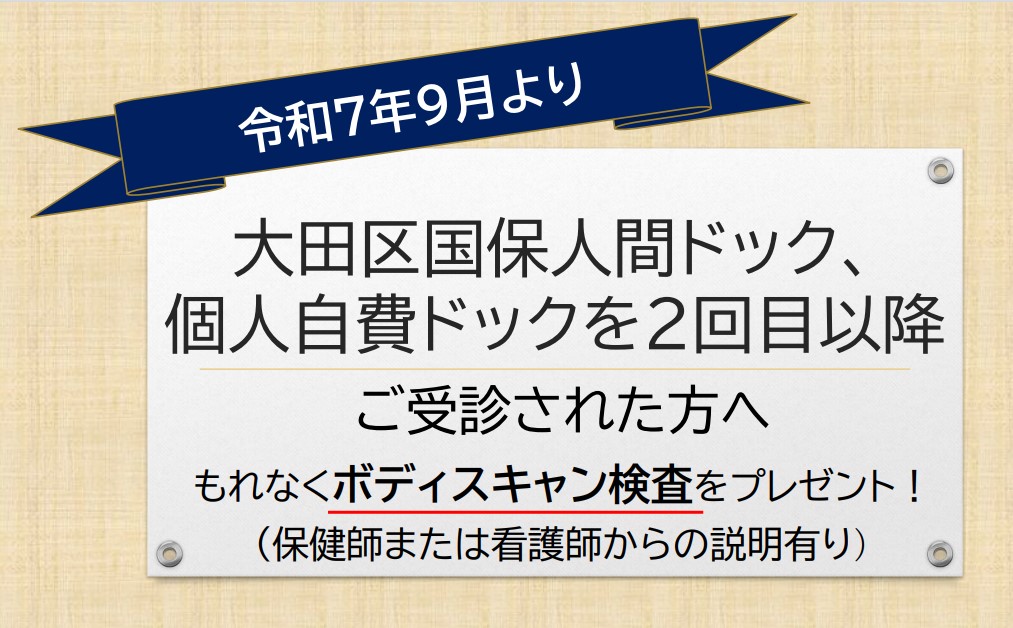 令和7年9月より、大田区国保人間ドック、健保補助を使わず自費ドックを2回目以降ご受診された方にボディスキャン検査(説明有り)をプレゼントしています。